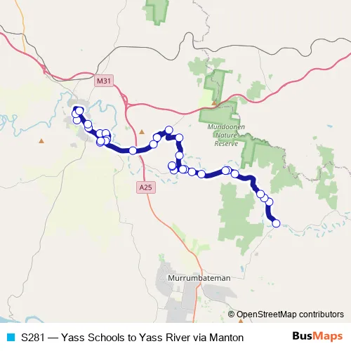 Click here to view the nearest S281 - Yass Schools to Yass River via Manton bus stop.