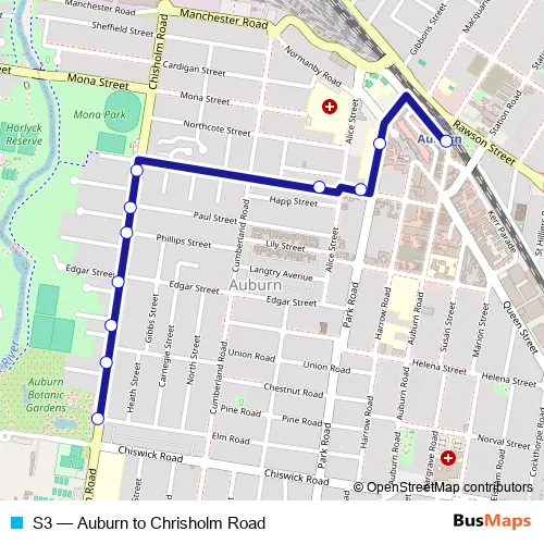 The first stop of the S3 bus route is Auburn Botanic Gardens, Chisholm Rd and the last stop is Auburn Station, South Pde, Stand A. S3 (Auburn to Chrisholm Road) is operational during on weekdays.