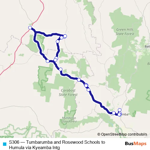 The first stop of the S306 bus route is Batlow Rd After Bogong St and the last stop is Rosewood Public School, Carabost St. S306 (Tumbarumba and Rosewood Schools to Humula via Kyeamba Intg) is operational during on weekdays.