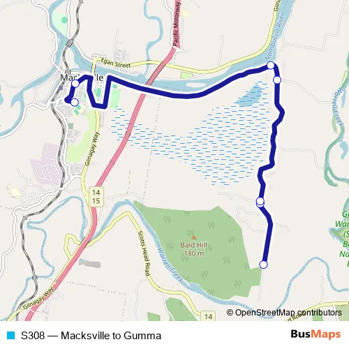 The first stop of the S308 bus route is Macksville High School, Boundary St and the last stop is Gumma Rd Opp Boultons Crossing Rd. S308 (Macksville to Gumma) is operational during on weekdays.