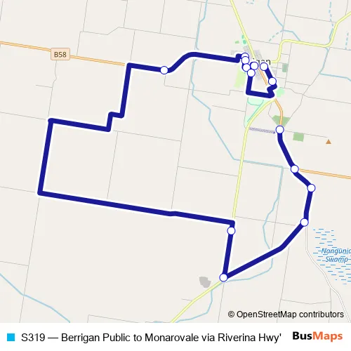 The first stop of the S319 bus route is Riverina Hwy At Ratcliffes Rd and the last stop is Berrigan Public School, Momalong St. S319 (Berrigan Public to Monarovale via Riverina Hwy') is operational during on weekdays.