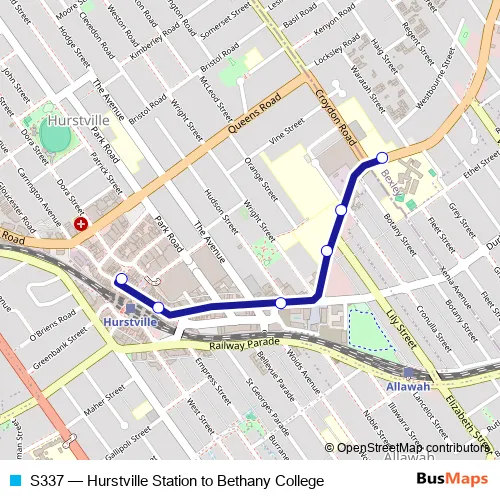 The first stop of the S337 bus route is Hurstville Station, Stand A and the last stop is Bethany College, Forest Rd. S337 (Hurstville Station to Bethany College) is operational during on weekdays.