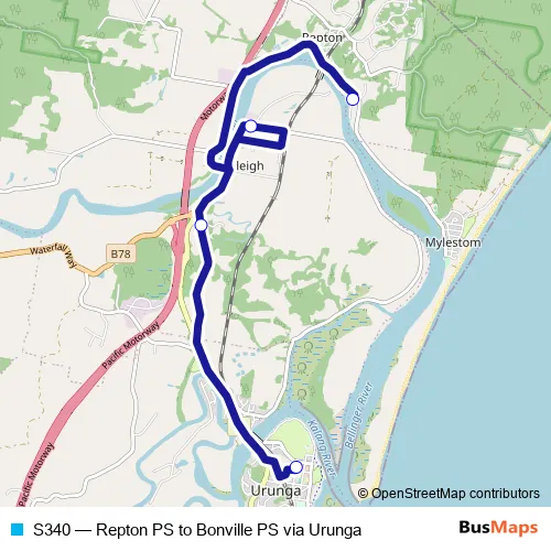 The first stop of the S340 bus route is Repton Public School, River St and the last stop is Urunga Public School, Orara St. S340 (Repton PS to Bonville PS via Urunga) is operational during on weekdays.