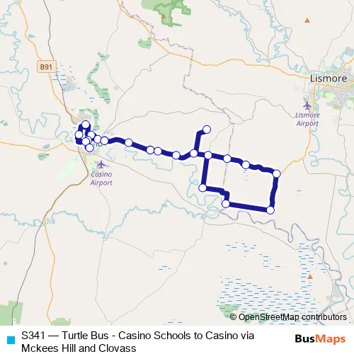 The first stop of the S341 bus route is Northern Rivers Buslines, Casino Depot and the last stop is Casino Public School, Walker St. S341 (Turtle Bus - Casino Schools to Casino via Mckees Hill and Clovass) is operational during on weekdays.