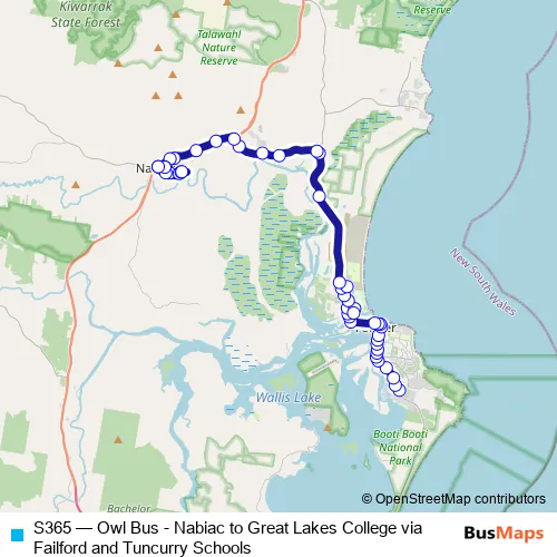 Click here to view the nearest S365 - Owl Bus - Nabiac to Great Lakes College via Failford and Tuncurry Schools bus stop.