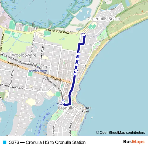 The first stop of the S376 bus route is Cronulla High School, Bate Bay Rd and the last stop is Cronulla Station, Cronulla St. S376 (Cronulla HS to Cronulla Station) is operational during on weekdays.