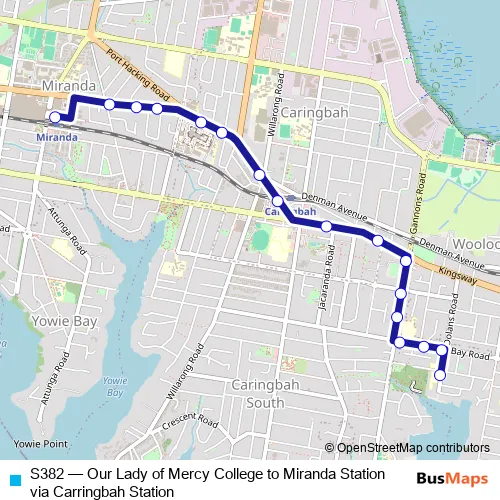 The first stop of the S382 bus route is Our Lady Of Mercy Catholic College, Dolans Rd and the last stop is Miranda Interchange, Urunga Pde, Stand 9. S382 (Our Lady of Mercy College to Miranda Station via Carringbah Station) is operational during on weekdays.