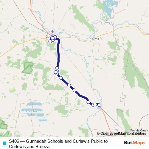 The first stop of the S406 bus route is Wolesley Park, Conadilly St and the last stop is Main St After Moffatt St. S406 (Gunnedah Schools and Curlewis Public to Curlewis and Breeza) is operational during on weekdays.