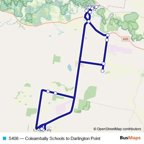 The first stop of the S408 bus route is St Peter's Primary School, Currawong Cres and the last stop is Kingfisher Av Opp Currawong Cres. S408 (Coleambally Schools to Darlington Point) is operational during everyday.