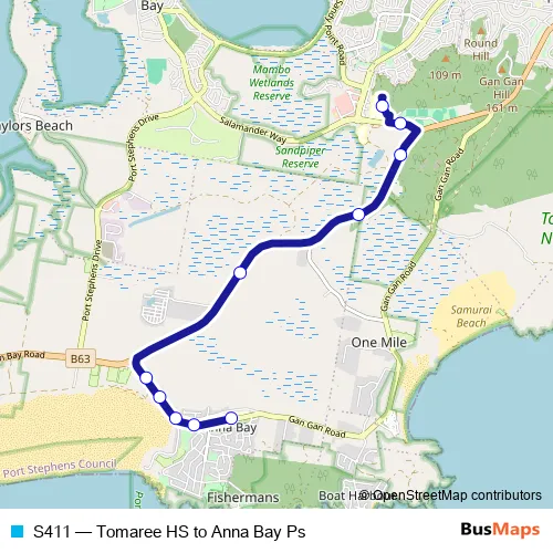 The first stop of the S411 bus route is Tomaree Education Centre, Bays 4-8 and the last stop is Anna Bay Public School, Gan Gan Rd. S411 (Tomaree HS to Anna Bay Ps) is operational during on weekdays.