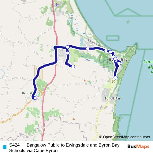 The first stop of the S424 bus route is Bangalow Public School, Byron St and the last stop is Byron Bay Public School, Kingsley St. S424 (Bangalow Public to Ewingsdale and Byron Bay Schools via Cape Byron) is operational during on weekdays.