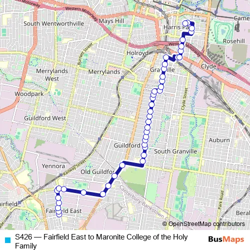 The first stop of the S426 bus route is Normanby St After Tangerine St and the last stop is Maronite College Of The Holy Family, Good St. S426 (Fairfield East to Maronite College of the Holy Family) is operational during on weekdays.