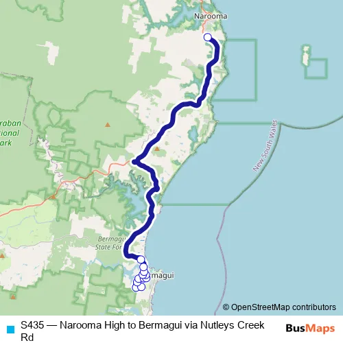 The first stop of the S435 bus route is Ocean View Dr After Nutleys Creek Rd and the last stop is Narooma High School. S435 (Narooma High to Bermagui via Nutleys Creek Rd) is operational during on weekdays.
