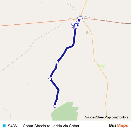 The first stop of the S436 bus route is Cobar Public School, Brennan St and the last stop is 5098 Bedooba Rd. S436 (Cobar Shools to Lerida via Cobar) is operational during on weekdays.