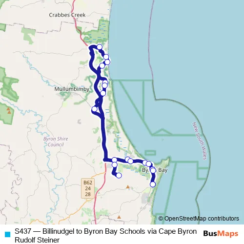 The first stop of the S437 bus route is Tasman Way Before Wollongbar St and the last stop is Byron Bay High School, Arakwal Ct. S437 (Billinudgel to Byron Bay Schools via Cape Byron Rudolf Steiner) is operational during on weekdays.