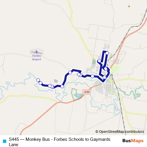 The first stop of the S445 bus route is Forbes Public School Infant Campus, Browne St and the last stop is 518 Gaymards Lane. S445 (Monkey Bus - Forbes Schools to Gaymards Lane) is operational during on weekdays.