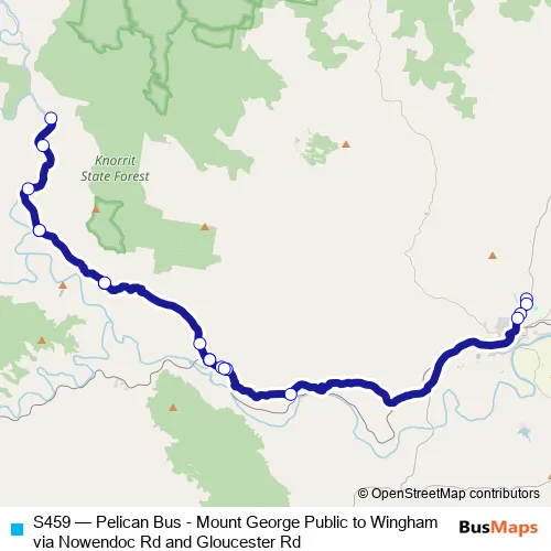 Click here to view the nearest S459 - Pelican Bus - Mount George Public to Wingham via Nowendoc Rd and Gloucester Rd bus stop.