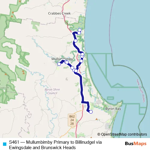 The first stop of the S461 bus route is Cape Byron Rudolf Steiner School, Balraith Lane and the last stop is Balemo Dr At Kulgun Ct. S461 (Mullumbimby Primary to Billinudgel via Ewingsdale and Brunswick Heads) is operational during on weekdays.