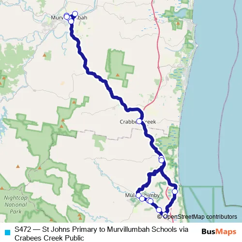 The first stop of the S472 bus route is Brunswick Valley Coaches Depot, Mogo Pl and the last stop is St Joseph's Catholic Primary School, Greville St. S472 (St Johns Primary to Murvillumbah Schools via Crabees Creek Public) is operational during on weekdays.