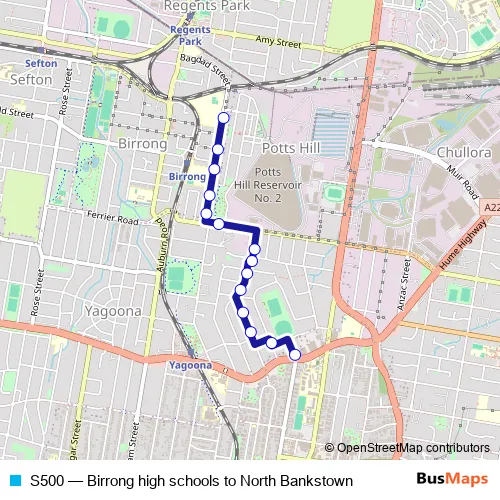 The first stop of the S500 bus route is Cooper Rd Opp Birrong Girls High School and the last stop is The Boulevarde At Hume Hwy. S500 (Birrong high schools to North Bankstown) is operational during on weekdays.