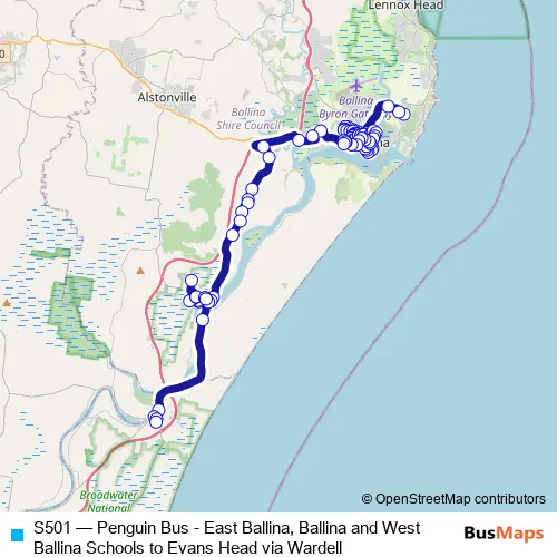 The first stop of the S501 bus route is Southern Cross Public School, Chickiba Dr and the last stop is George St At Broadwater Evans Head Rd. S501 (Penguin Bus - East Ballina, Ballina and West Ballina Schools to Evans Head via Wardell) is operational during on weekdays.
