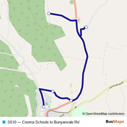 The first stop of the S510 bus route is Mittagang Rd Opp Monaro High School and the last stop is Bunyanvale Rd Opp Binjura Rd. S510 (Cooma Schools to Bunyanvale Rd) is operational during on weekdays.