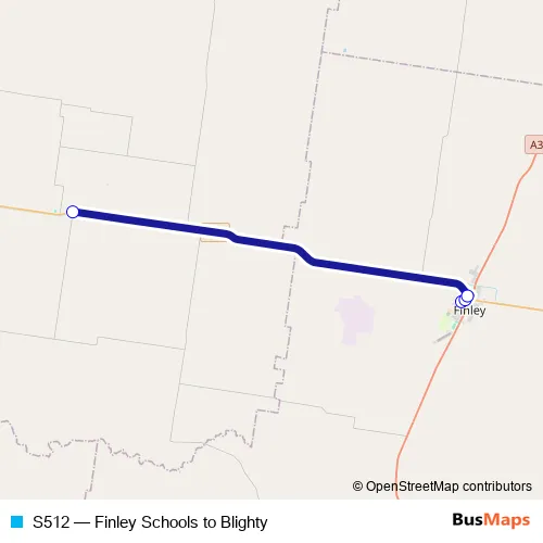 The first stop of the S512 bus route is Finley High School, Tocumwal St and the last stop is Riverina Hwy At Pyles Rd. S512 (Finley Schools to Blighty) is operational during on weekdays.