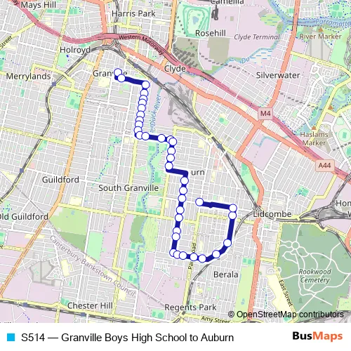 The first stop of the S514 bus route is Granville Boys High School, Hutchinson St and the last stop is Park Rd At Chiswick Rd. S514 (Granville Boys High School to Auburn) is operational during on weekdays.