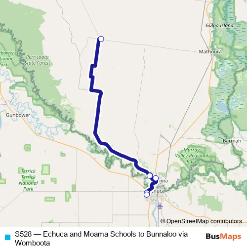 Click here to view the nearest S528 - Echuca and Moama Schools to Bunnaloo via Womboota bus stop.