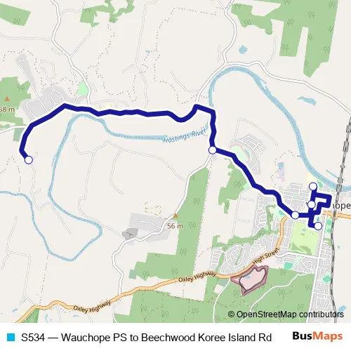 The first stop of the S534 bus route is Wauchope Public School, Campbell St and the last stop is Koree Island Rd At Karri Cl. S534 (Wauchope PS to Beechwood Koree Island Rd) is operational during on weekdays.