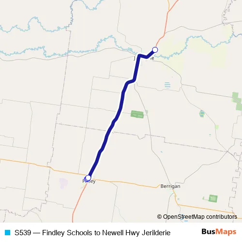 The first stop of the S539 bus route is Finley High School, Tocumwal St and the last stop is Newell Hwy Opp Old Urana Rd. S539 (Findley Schools to Newell Hwy Jerilderie) is operational during on weekdays.