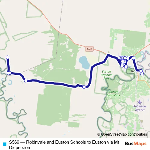 The first stop of the S569 bus route is Robinvale College and the last stop is 2971 Tapalin Mail Rd. S569 (Robinvale and Euston Schools to Euston via Mt Dispersion) is operational during on weekdays.
