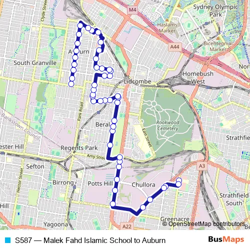 The first stop of the S587 bus route is Malek Fahd Islamic School, Waterloo Rd and the last stop is Cumberland Rd Before Wellington Rd. S587 (Malek Fahd Islamic School to Auburn) is operational during on weekdays.