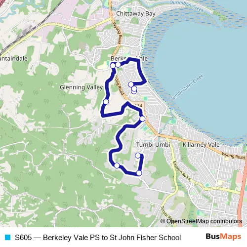 The first stop of the S605 bus route is Berkeley Vale Public School, Waroon Av and the last stop is St John Fisher Primary School, Hicks Lane. S605 (Berkeley Vale PS to St John Fisher School) is operational during on weekdays.