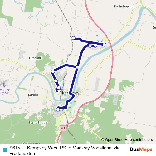 The first stop of the S615 bus route is Kempsey West Public School, Marsh St and the last stop is Queen St Opp Macleay Vocational College. S615 (Kempsey West PS to Macleay Vocational via Frederickton) is operational during on weekdays.