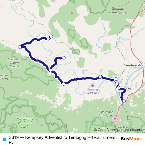 The first stop of the S619 bus route is Kempsey Adventist School and the last stop is Temagog Rd At Armidale Rd. S619 (Kempsey Adventist to Temagog Rd via Turners Flat) is operational during on weekdays.