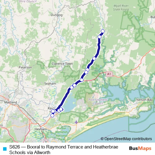 The first stop of the S626 bus route is Booral Rd Before The Bucketts Way and the last stop is Adelaide St, Hunter River High School. S626 (Booral to Raymond Terrace and Heatherbrae Schools via Allworth) is operational during on weekdays.