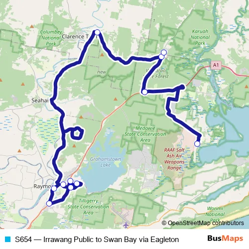 The first stop of the S654 bus route is Irrawang Public School, Morton St and the last stop is 115 Moffats Rd. S654 (Irrawang Public to Swan Bay via Eagleton) is operational during on weekdays.