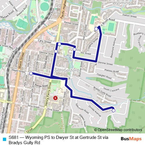 The first stop of the S681 bus route is Wyoming Public School, Maidens Brush Rd and the last stop is Dwyer St Before Hills St. S681 (Wyoming PS to Dwyer St at Gertrude St via Bradys Gully Rd) is operational during on weekdays.