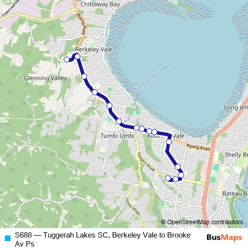 The first stop of the S688 bus route is Tlsc Berkeley Vale Campus, Berkeley Rd and the last stop is Brooke Av Before Tyrell Pl. S688 (Tuggerah Lakes SC, Berkeley Vale to Brooke Av Ps) is operational during everyday.