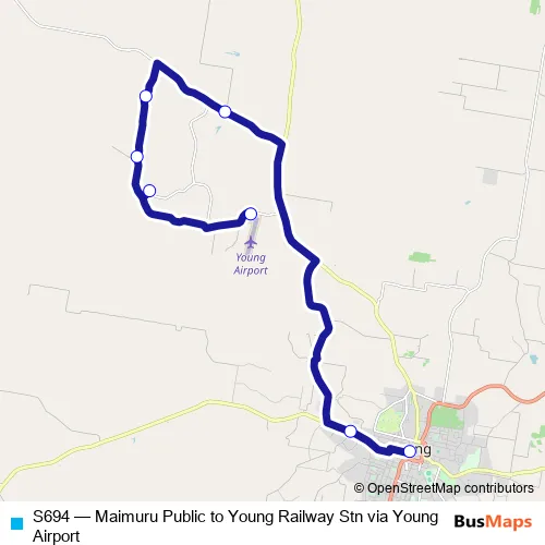The first stop of the S694 bus route is Maimura Public School and the last stop is Young Information Centre. S694 (Maimuru Public to Young Railway Stn via Young Airport) is operational during on weekdays.