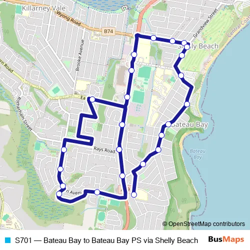 The first stop of the S701 bus route is Central Coast Hwy At Rays Rd and the last stop is Bateau Bay Public School, Marlow Rd. S701 (Bateau Bay to Bateau Bay PS via Shelly Beach) is operational during on weekdays.