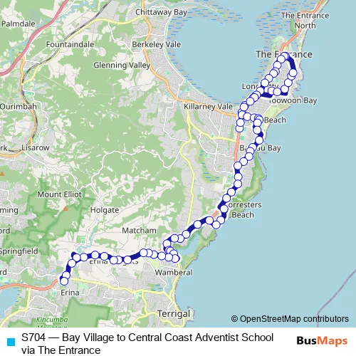 The first stop of the S704 bus route is Central Coast Hwy Before Bay Village Rd and the last stop is Central Coast Adventist School, Penrose Cres. S704 (Bay Village to Central Coast Adventist School via The Entrance) is operational during on weekdays.