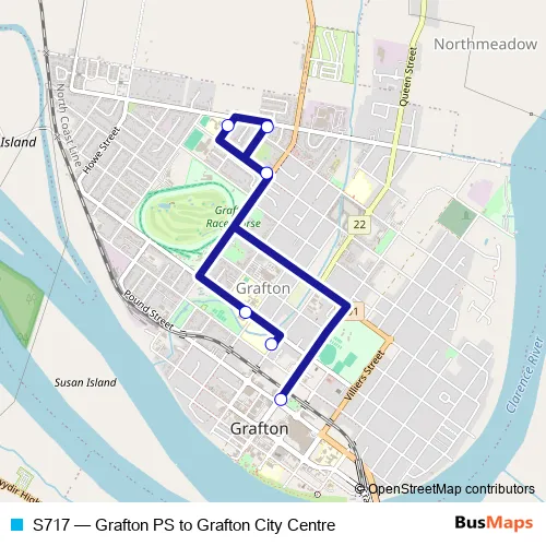 The first stop of the S717 bus route is Grafton Public School, Queen St and the last stop is Market Square, Prince St. S717 (Grafton PS to Grafton City Centre) is operational during on weekdays.