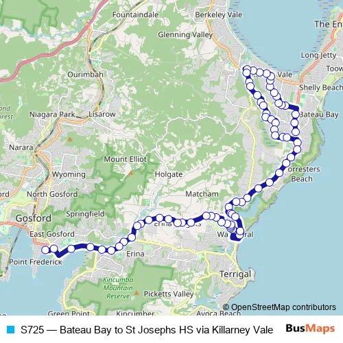 The first stop of the S725 bus route is Central Coast Hwy Opp Bateau Bay Rd and the last stop is St Edwards College, Russell Drysdale St. S725 (Bateau Bay to St Josephs HS via Killarney Vale) is operational during on weekdays.