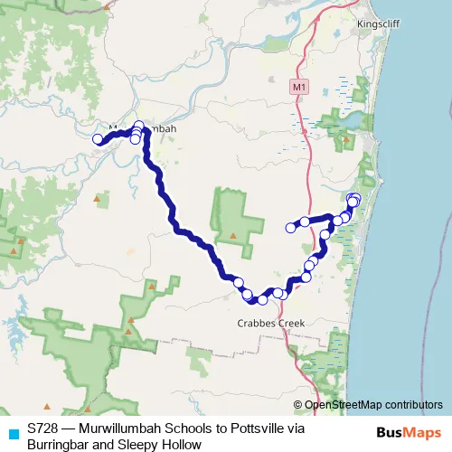 The first stop of the S728 bus route is Cudgera Creek Rd At Cabbage Gum Rd and the last stop is Wollumbin High School. S728 (Murwillumbah Schools to Pottsville via Burringbar and Sleepy Hollow) is operational during on weekdays.