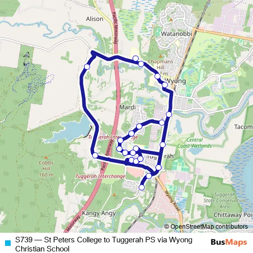 The first stop of the S739 bus route is St Peters Catholic College Bus Bay and the last stop is Tuggerah Public School, Pacific Hwy. S739 (St Peters College to Tuggerah PS via Wyong Christian School) is operational during on weekdays.