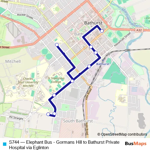 The first stop of the S744 bus route is Bathurst Public School, Rocket St and the last stop is Bathurst City, Howick St, Stand B. S744 (Elephant Bus - Gormans Hill to Bathurst Private Hospital via Eglinton) is operational during on weekdays.