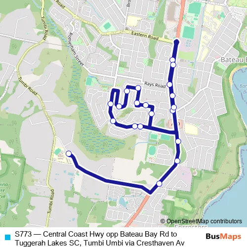 The first stop of the S773 bus route is Central Coast Hwy Opp Bateau Bay Rd and the last stop is Tlsc Tumbi Umbi Campus. S773 (Central Coast Hwy opp Bateau Bay Rd to Tuggerah Lakes SC, Tumbi Umbi via Cresthaven Av) is operational during on weekdays.