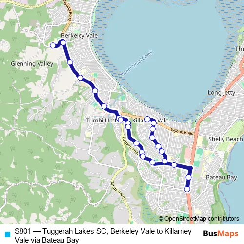 The first stop of the S801 bus route is Tlsc Berkeley Vale Campus, Berkeley Rd and the last stop is Wyong Rd Before Henricks Rd. S801 (Tuggerah Lakes SC, Berkeley Vale to Killarney Vale via Bateau Bay) is operational during on weekdays.